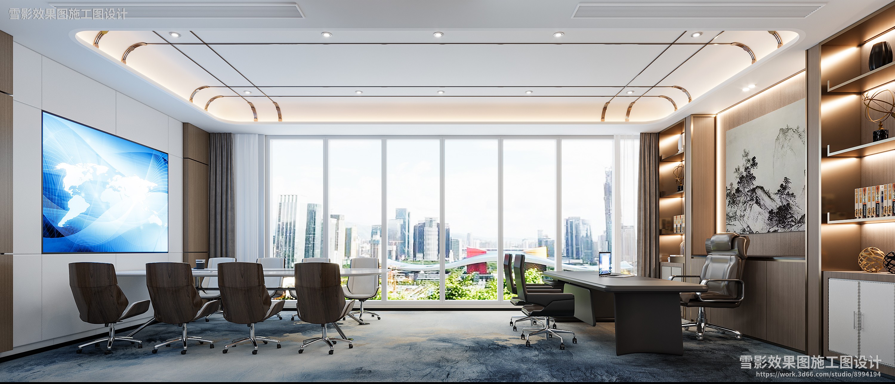 【作品案列】雪影效果图施工图设计 丨董事长办公室
